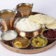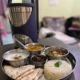Traditional Indian platter with roti, rice, dal, seasonal vegetable, salad, pickle, and sweet dish
